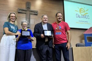 O encontro foi encerrado com uma homenagem especial à Ir. Rita Cola, por sua trajetória dedicada à educação no Espírito Santo, e a entrega de uma placa de agradecimento a Dom Ângelo, simbolizando o reconhecimento da ANEC ao seu pastoreio e incentivo à missão educativa.